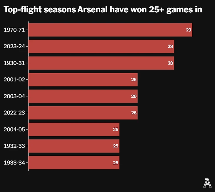 «Канониры» выигрывали 25 + матчей за сезон в девяти розыгрышах лиги, причем два из них пришлись на последние две кампании. Пять из девяти этих сезонов прошли в эпоху Премьер-Лиги. Шесть самых ранних хронологически из этих девяти сезонов «Арсенал» закончил с чемпионским титулом, самые поздние три сезона закончил на втором месте в лиге.