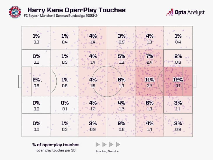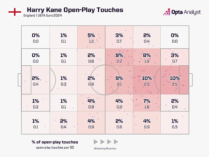 Как вы можете видеть из приведенных ниже карт зон касания, 39% касаний Кейна в открытой игре в Бундеслиге под руководством Тухеля приходились на среднюю треть поля, по сравнению с 44% касаний за Англию на Евро-2024, в то время как 23% касаний «Баварии» приходилось на центральные зоны последней трети поля, по сравнению с 20% касаний за Англию на Евро.