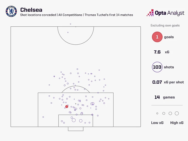 Тухель не проигрывал в первых 14 матчах за «синих» после своего назначения в январе 2021 года. Это самая продолжительная серия без поражений, когда-либо зафиксированная менеджером «Челси» в начале его пребывания в клубе. Главное в этом было то, как Тухель превратил их в команду, которая была настолько сильна в обороне. «Челси» сохранил свои ворота на замке в 12 из 14 первых матчей Тухеля и пропустил всего два гола в двух других играх.