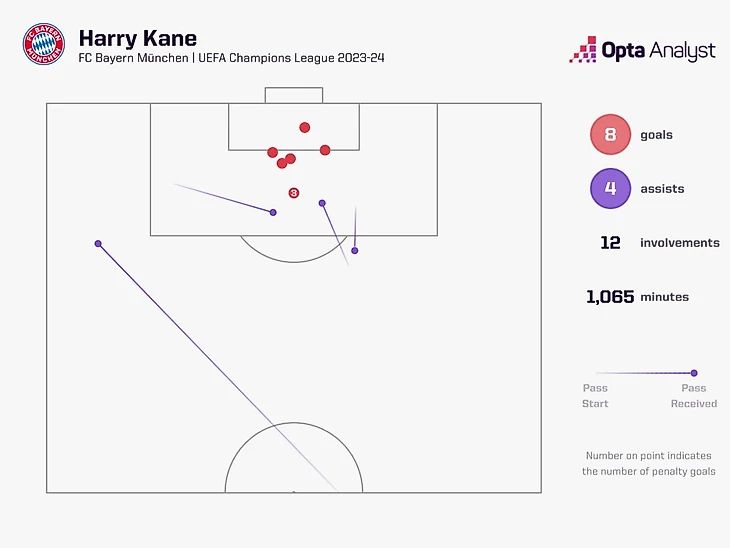 Кейн также принял непосредственное участие в 12 голах «Баварии» за выход в полуфинал Лиги Чемпионов (восемь голов, четыре передачи), что является рекордом для английского игрока за одну кампанию в турнире.