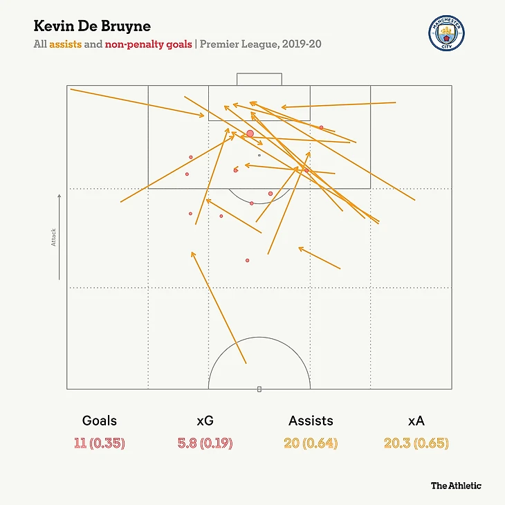 Сезон 2019-2020, вероятно, стал лучшим индивидуальным перфомансом Де Брюйне, и его дальние передачи были действительно очень хороши.