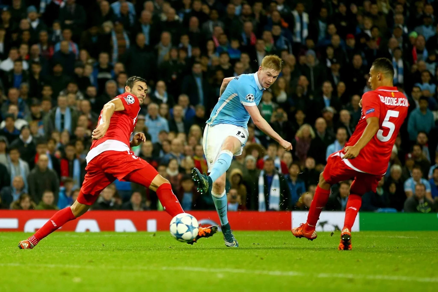 Пеллегрини назвал его «во всех смыслах идеальным игроком для нашей команды» из-за его креативности и способности забивать голы после того, как Де Брюйне забил победный гол в Лиге Чемпионов в матче с «Севильей» в один из самых запоминающихся вечеров «Сити» в том сезоне. Он начинал матч на левом фланге, но его перевели в центр, а забил он этот гол, играя справа.