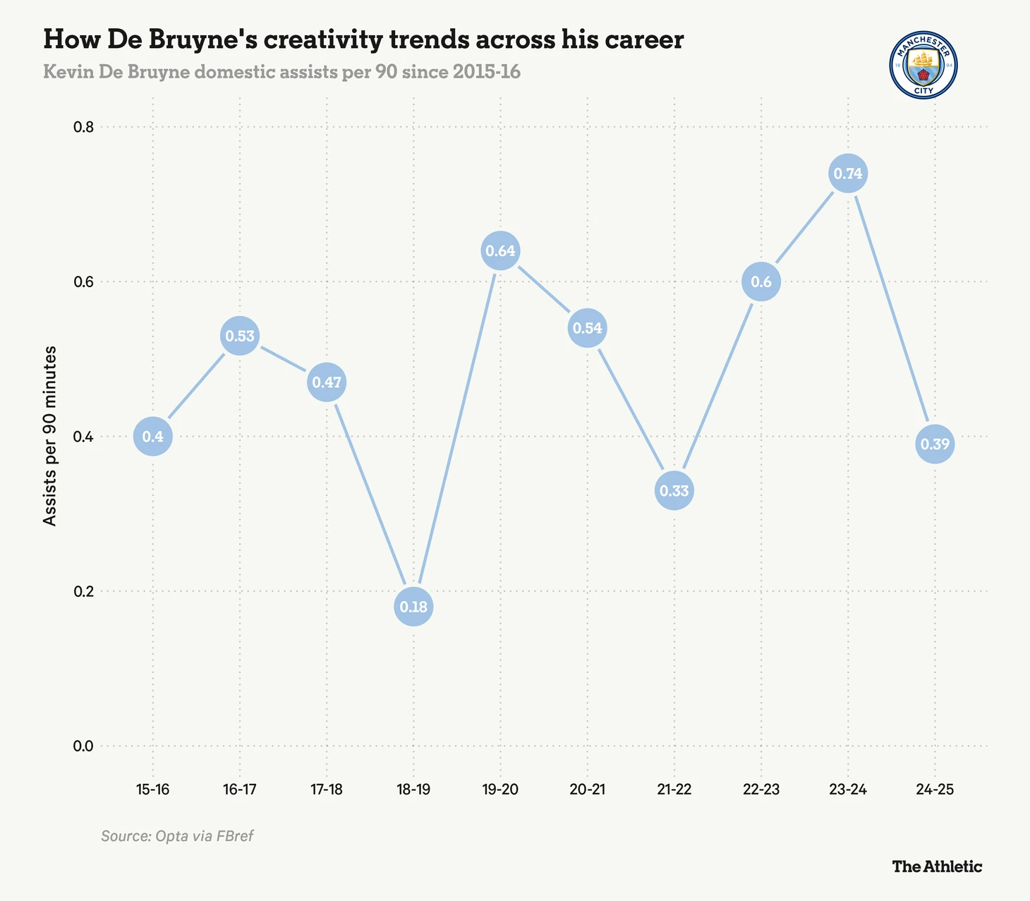 В этом году бельгиец сравнялся с Тьерри Анри по количеству результативных передач в чемпионате за сезон, и хотя Де Брюйне до сих пор не нравится, что Премьер-лига отняла у него 21-ю результативную передачу (но позже включила ее в собственное видео, посвященное его 100-й результативной передаче в турнире), тот факт, что с того времени никто кроме Мо Салаха не подбирался к этому рекорду, показывает, насколько элитным «курьером» был Кевин.