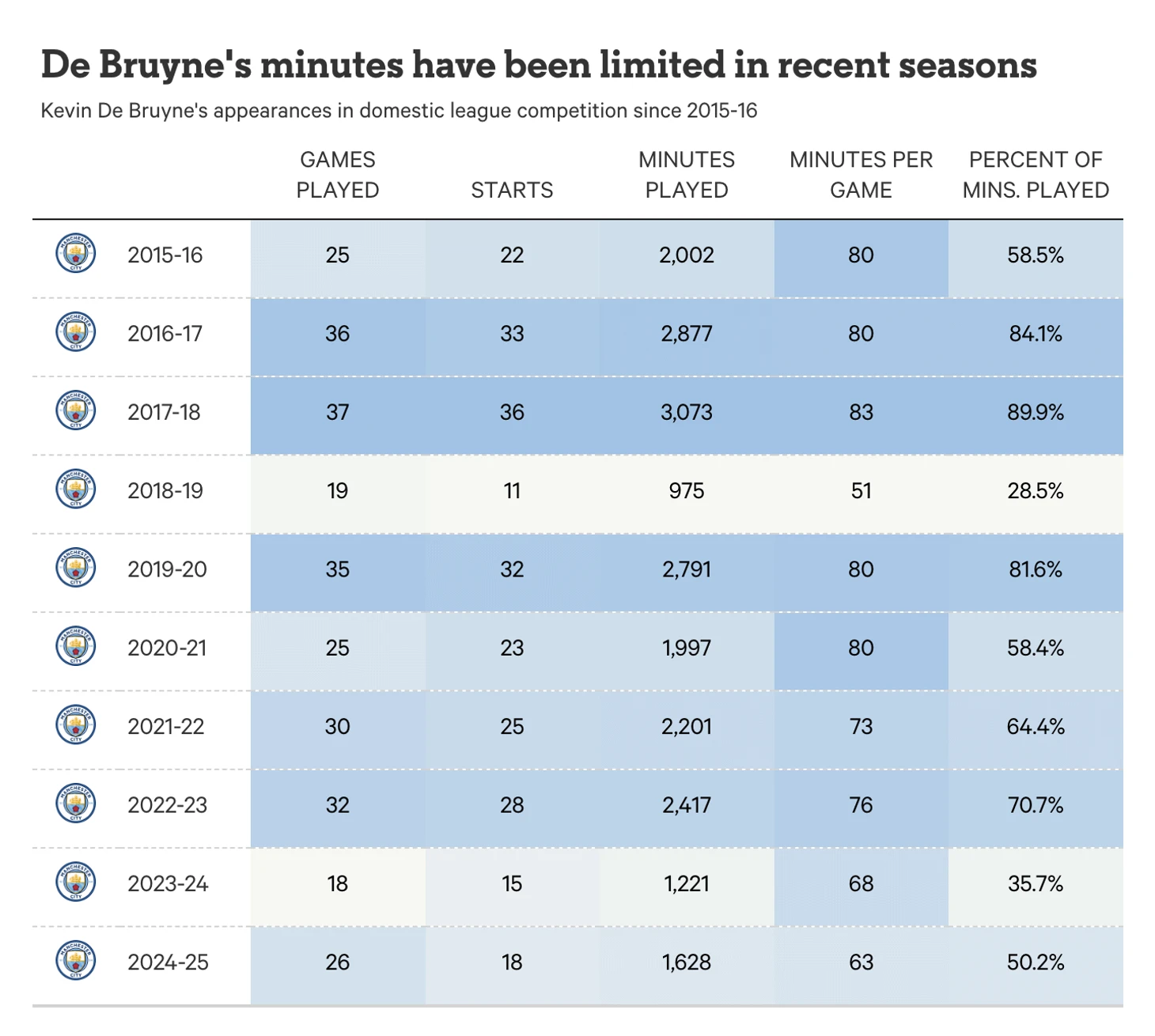 Эти цифры могут показаться не такими высокими, как вы ожидаете, но помните, что Де Брюйне пропустил половину прошлого сезона, а также большую часть этого сезона из-за травмы. После возвращения в январе прошлого года он сделал 10 результативных передач, что позволило ему занять третье место в гонке ассистентов в лиге в прошлом сезоне, несмотря на то, что он сыграл всего в 18 из 38 матчей «Сити» в чемпионате.