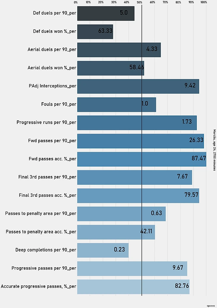 Довольно плохие показатели в защите, а также средне наверху, но один из лучших по продвижению мяча в лиге. Довольно агрессивный в защите. Будет хорош в УПЛ, где Динамо придется взламывать низкий блок, но могут возникнуть проблемы в ЛЧ. Выводы сделал только по стате, т.к. ещё не смотрел много его игр.