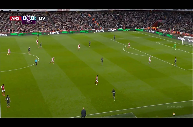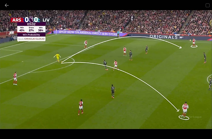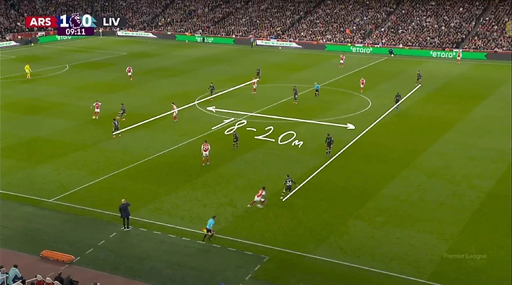 Но есть и обратная сторона. Когда обороняющаяся команда «сжимает» поле до 20 метров, за ней появляется пространство для передачи в свободную зону. Так Букайо Сака открыл счет на 9-й минуте. Бен Уайт, получив слишком много времени на мяче, сделал длинную передачу, которая миновала все линии обороны Ливерпуля и позволила вингеру «канониров» обыграть Робертсона и открыть счет.