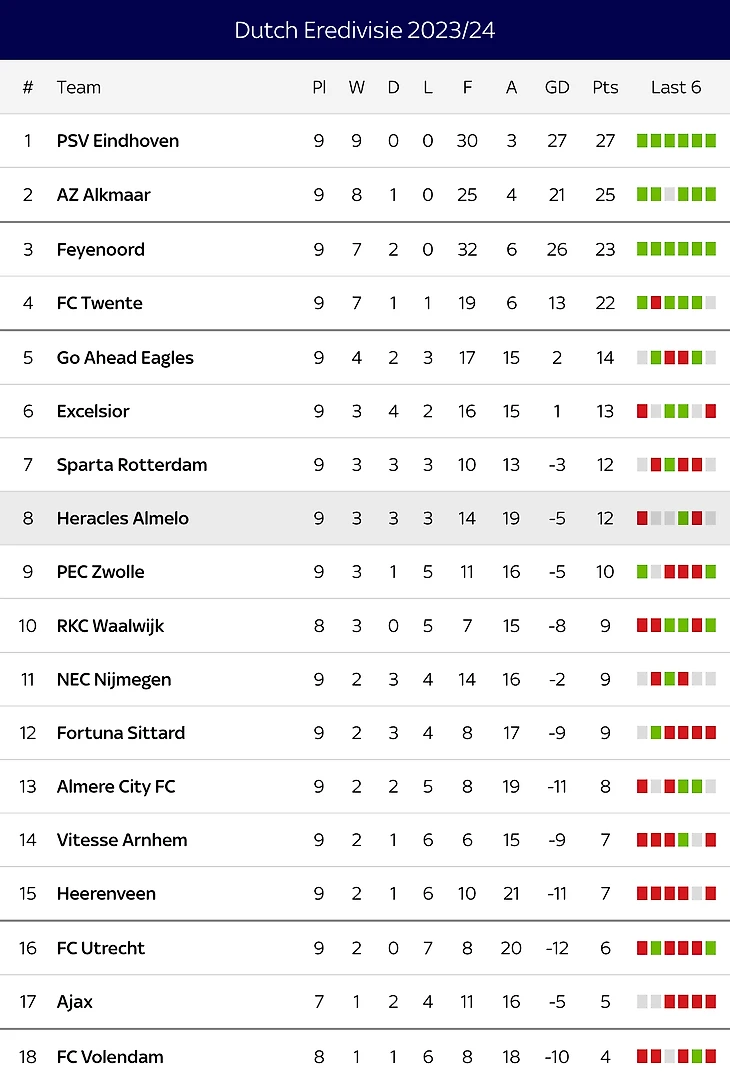 «Эксельсиор» опускается на 6-е место, а «ПЕК Зволле» - на 9-е.