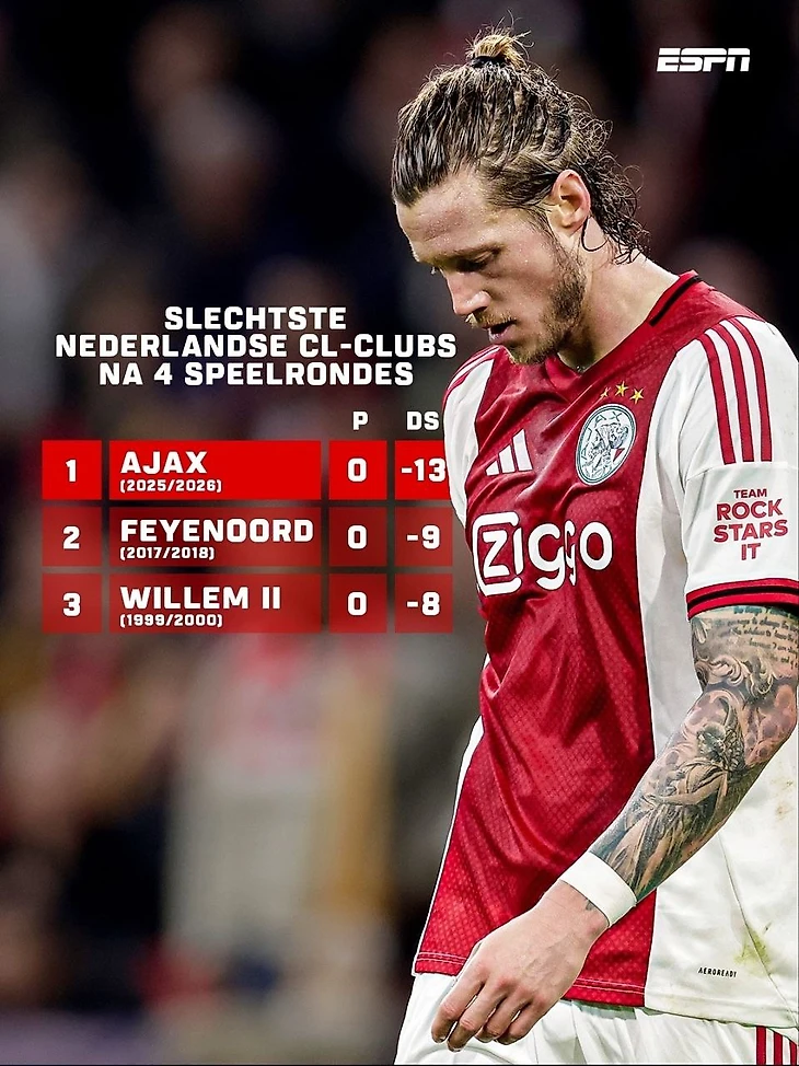 Просто посмотрите на эту позорную статистику «Аякса» сейчас. Это таблица худших голландских команд после 4-х туров ЛЧ за все время