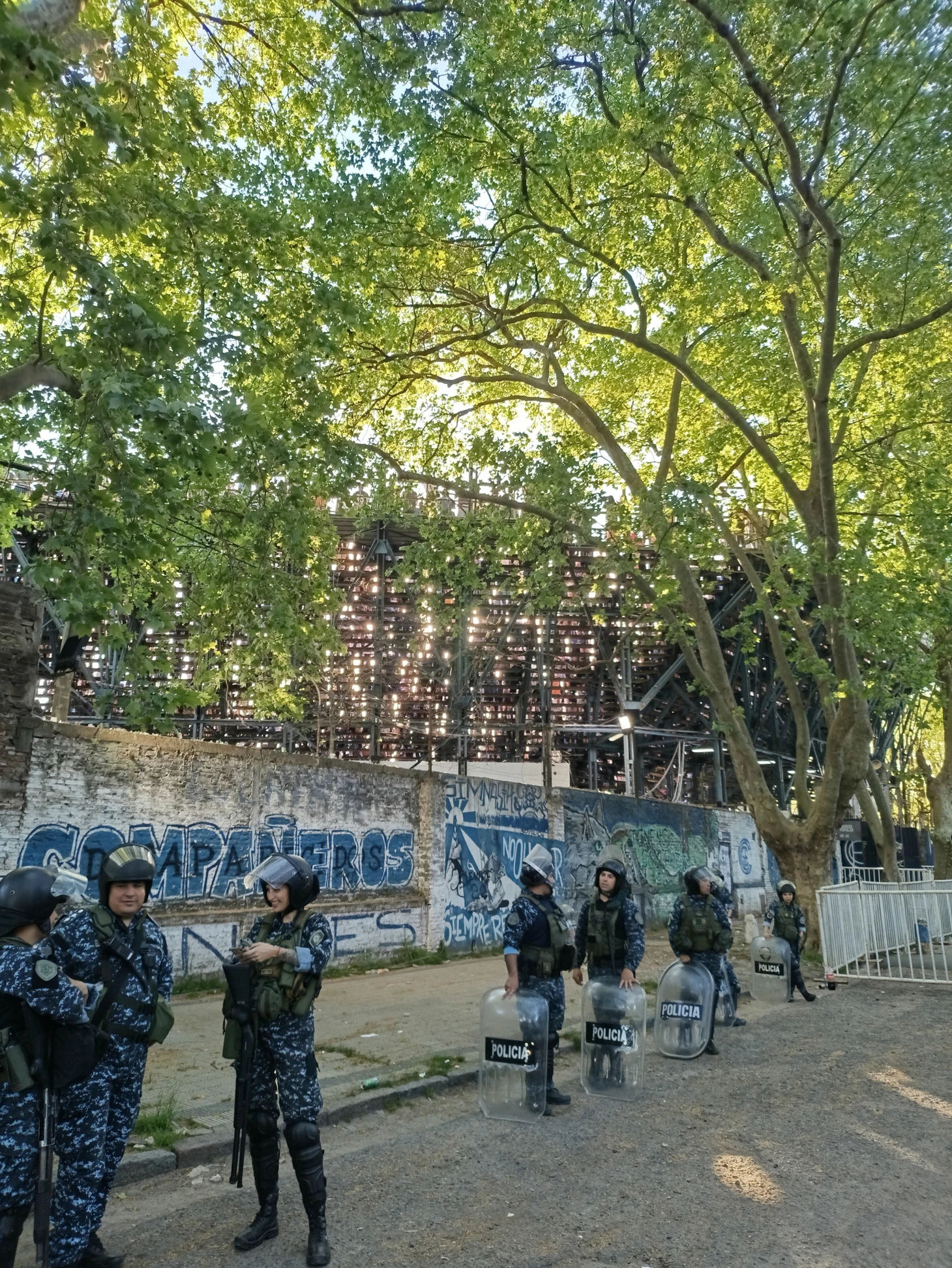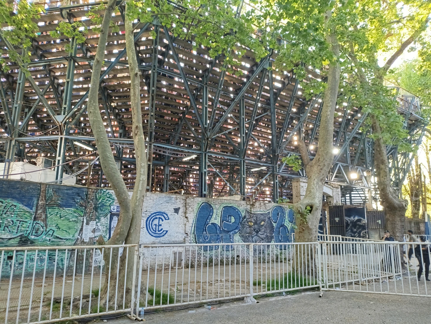 Уже подходя к своей трибуне, я понял главную прелесть стадиона Химнасии. Среди деревьев прячется метало-бетонная конструкция, которая полностью просвечивается солнцем. Такие трибуны я видел впервые. Вероятно, это такое бюджетное исполнение, но мне оно очень понравилось: оригинальное и стильное, укрытое деревьями. Выглядело красиво. Я поспешил зайти на стадион, так как игра уже началась, трибуны уже шумели во всю.
