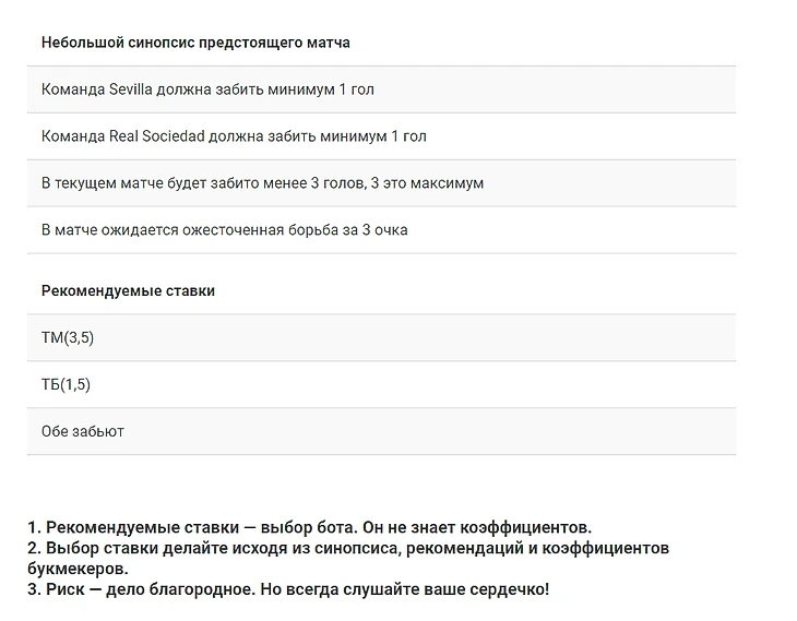 Сейчас бот работает, казалось бы, просто. Выбираешь команду 1 и команду 2, и жмякаешь на кнопку "Анализ статистики". Далее попадаешь на небольшое вводное слово, пока идет обработка данных и основной расчет. Нажимаешь на ссылку (единственную на странице) и получаешь пару таблиц последних игр команд, чтобы понимать хоть примерно, какие данные анализировались. И далее сами рекомендации к матчу в таком виде: