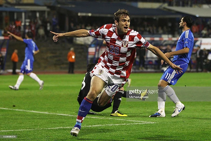 (Никица Елавич празднует гол, который отменили, во встрече квалификации к Евро-2012)