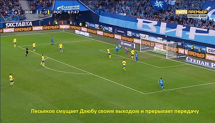 Голкипер «Ростова» неоднократно шел на выходы в матче с «Зенитом». И неизменно удачно. Дважды он выходил к линии штрафной, не давая шансов Артему Дзюбе побороться за вертикальный заброс, несколько раз прерывал верховые фланговые подачи, однажды не побоялся пойти в борьбу с Дзюбой после подачи с бровки.