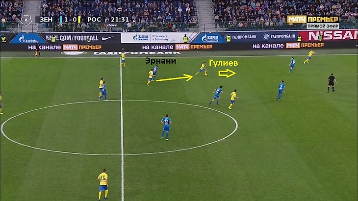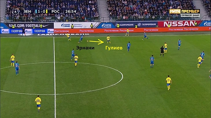 В первом тайме «Зенит» встречал соперника у средней линии поля. «Ростов» нашел слабость в зоне Эрнани - Гулиев получал мяч за спиной у бразильца.