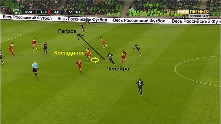 Другого опорника «Арсенала» - Костадинова - выключил из игры Перейра. Когда хав выбросился на уругвайца, тот быстро адресовал мяч включившемуся справа Петрову. Вернуться назад Костадинов не успел.