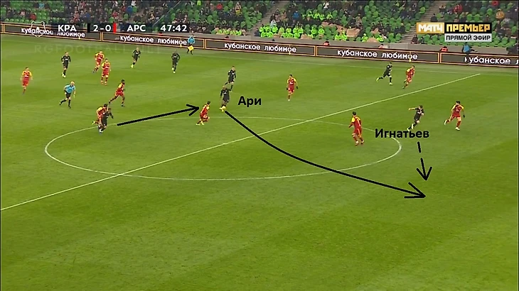 Впервые в текущем розыгрыше РПЛ русский бразилец сыграл на позиции оттянутого форварда/атакующего полузащитника - выдвинутым нападающим у «Краснодара» был Игнатьев. Получилось удачно: в активе Ари в матче с «Арсеналом» голевая передача и участие еще в одной результативной атаке. Что интересно, в обоих эпизодах нападающий подыгрывал партнерам в одно касание.