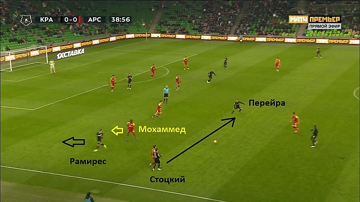 Изначально южане атаковали по левому флангу. Под владеющего мячом Стоцкого забежал Рамирес. Так как первого встречал правый защитник «Арсенала» Комбаров, на рывок второго вынужден был среагировать опорник Мохаммед. Стоцкий выключил его из игры быстрым пасом поперек поля на Перейру. В итоге Мохаммед не успел перестроиться.