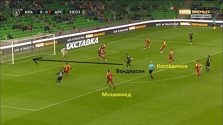 «Быки» забили два очень похожих гола по геометрии подготовительной фазы атаки - первый и третий. Оба раза команда Мурада Мусаева вносила дисбаланс в оборону «Арсенала», быстро двигая мяч поперек поля, после чего следовало обострение.