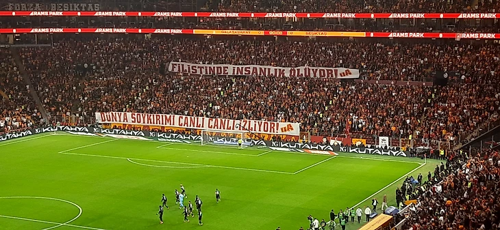 Ровно в 20.00 команды вышли на поле, а болельщики «Галатасарая» вывесили 2 баннера: первый – в поддержку главного тренера «Бешикташа» Серджана Ялчина (внимание, болельщики хозяев повесили баннер в поддержу тренера соперников – круто!), у которого не так давно случилось горе в семье; второй – посвящен событиям на Ближнем Востоке.