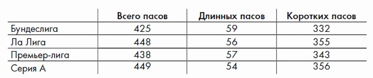 В продолжение Дэвид и Крис переходят к статистике пасов (таблица 2), ударов и стандартов (таблица 3), чтобы найти особенности в стиле игры. Но мы видим, что в техничной Испании не меньше длинных передач, чем в прямолинейной Англии, а общее количество пасов в матче в Серии А превосходит аналогичный показатель в Ла Лиге.