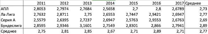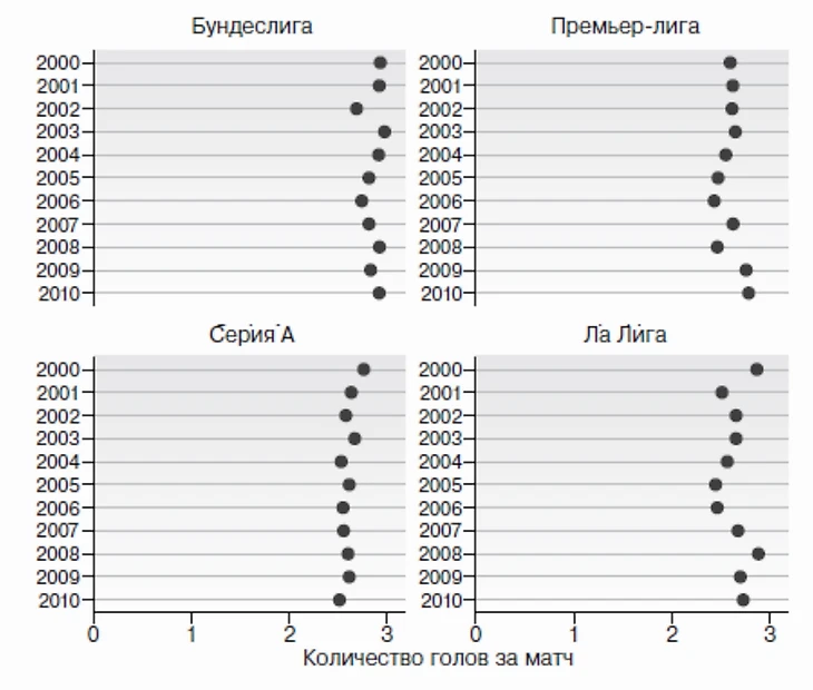 Заметим, что разница результативности матчей по годам в каждой отдельной лиге выглядит независимой от других лиг. Следовательно, изменение средних чисел по сезонам можно объяснить статистическим отклонением (или ошибкой). Данные выходят близкими к значениям прошлых сезонов, описанных в книге.