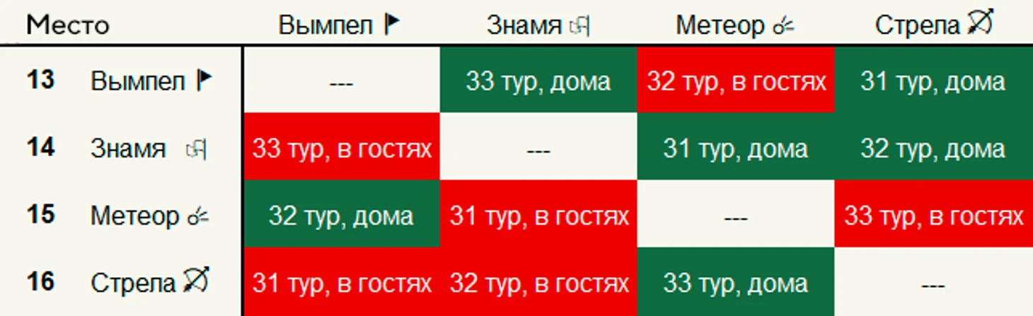 Команды 13-16 играют мини-круговой турнир друг с другом (31-33 туры) за последние 4 места. Очередность и хозяева поля определяются в этом турнире по следующему принципу: