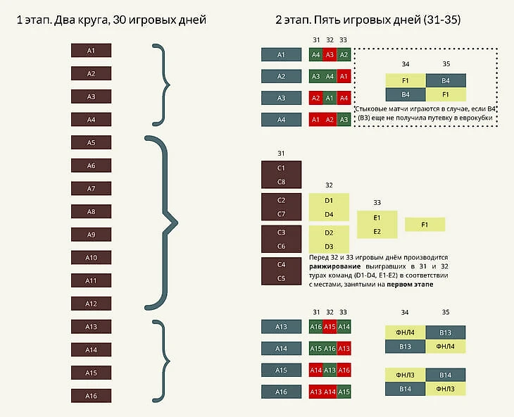 1. С учетом стыков турнир будет разыгран за 35 игровых дней. Это на 3 дня больше, чем сейчас (32), и на 1 день меньше, чем в формате Юпитер 16 (36).