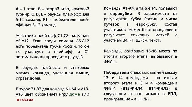 Наконец, 7-8 места сразятся за право оспорить последнюю путевку в Лигу Конференций с 4-м местом, а 13-14 места сыграют стыковые матчи за право остаться в РПЛ на следующий сезон с 3-4 местами ФНЛ. С учетом стыковых матчей для розыгрыша сезона по этой схеме потребуется 36 игровых дней, что на 4 дня больше, чем в нынешнем календаре (30 туров + 2 стыковых матча).