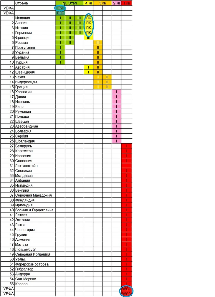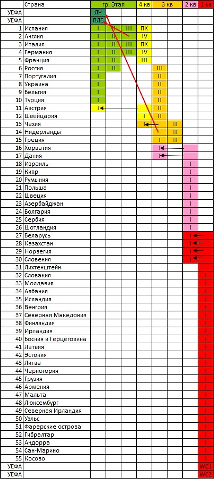 (расшифровка – ЛЧ - представитель Лиги Чемпионов, ПЛЕ – победитель Лиги Европы, I – чемпион страны, II – второе место в национальном первенстве, III – третье место в национальном первенстве, ПК – победитель национального Кубка, WC1, WC2 – обладатели Wild card).