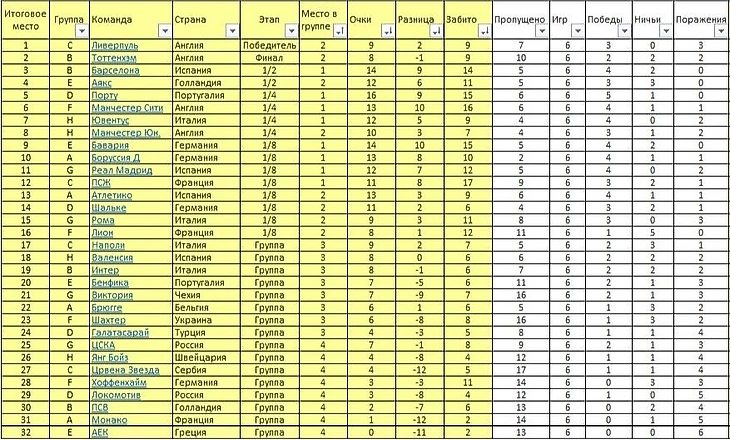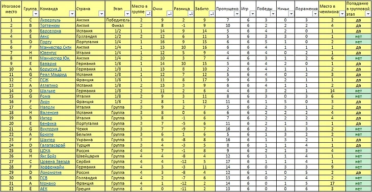 Таблица 1. Итоговая таблица ЛЧ сезона 2018/19