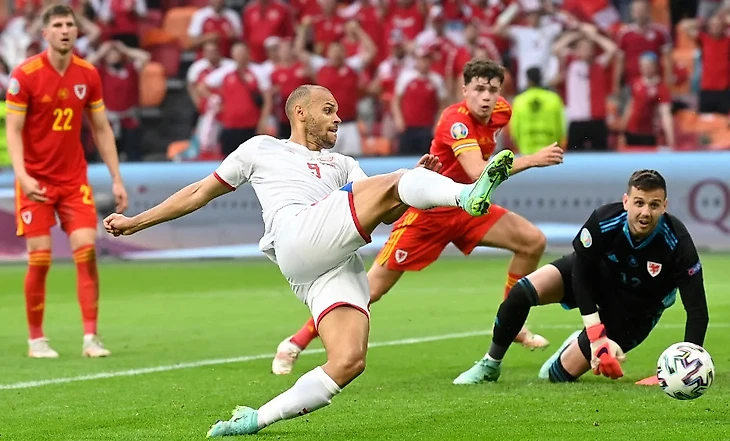 Спустя 5 минут Дольсберг мог оформить дубль, однако после прострела все того же Дамсгора форвард "Ниццы" пробив внешней стороной стопы, попал в игрока сборной Уэльса, присевшего на газон рядом со штангой. В конце тайма датчане снова создали опасный момент, но забить не сумели.