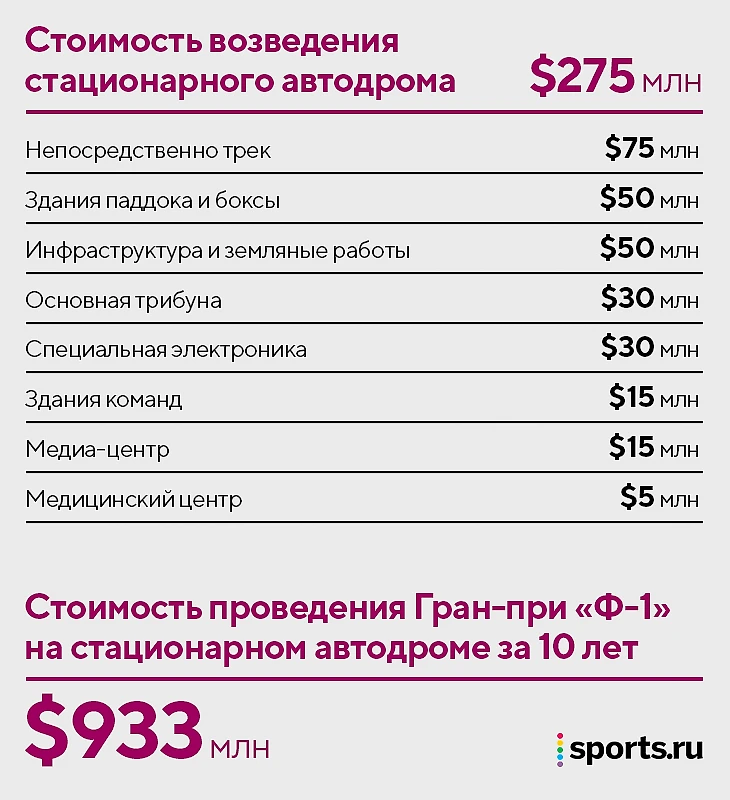 Правда, взнос в «Формуле-1» за право проведения гонки на стационарном треке в разы ниже по сравнению с городскими этапами – в среднем $18 млн (от 10 до 45 миллионов в зависимости от расположения, рынка и исторического бэкграунда). И если брать все тот же десятилетний период, то на возведение и содержание отдельной трассы уйдет $933 млн.