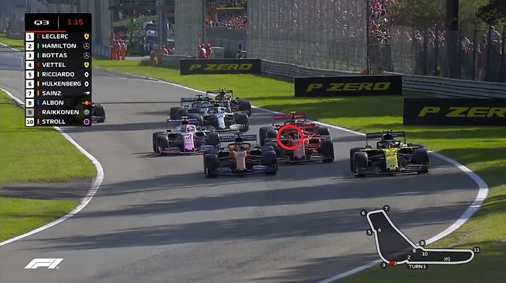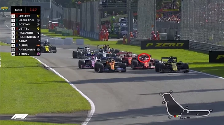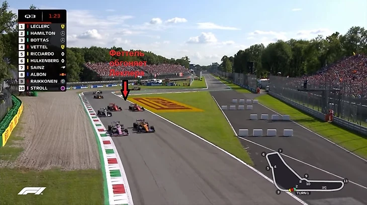 Однако далеко не все собирались оттормаживаться. Одним из таких пилотов был Себастьян Феттель. К слову, за него обиднее всего, ведь у немца был шанс значительно улучшить свое положение. Из всех гонщиков он, наверное, единственный торопился.. На скриншоте ниже видно, как Себ обгоняет Шарля в попытке успеть на быстрый круг: