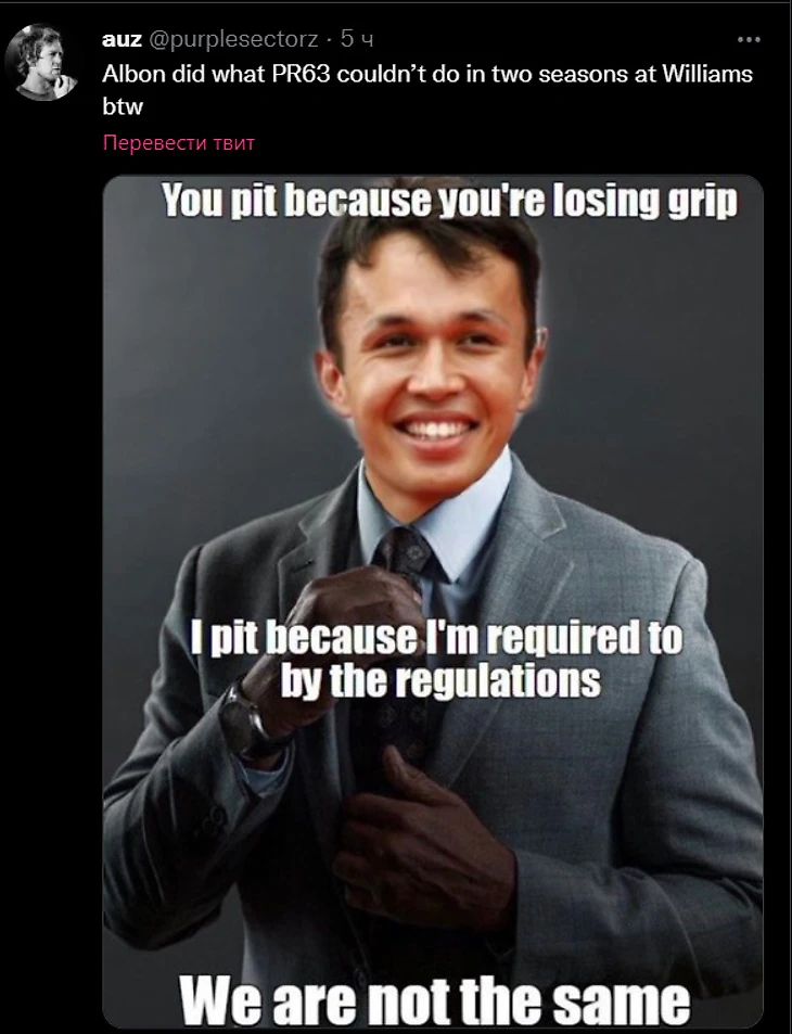 И вставляют его в известный мем с Джанкарло Эспозито: «Ты заезжаешь на пит-стоп из-за потери сцепления. Я заезжаю, потому что от меня этого требуют правила. Мы с тобой на разных уровнях».