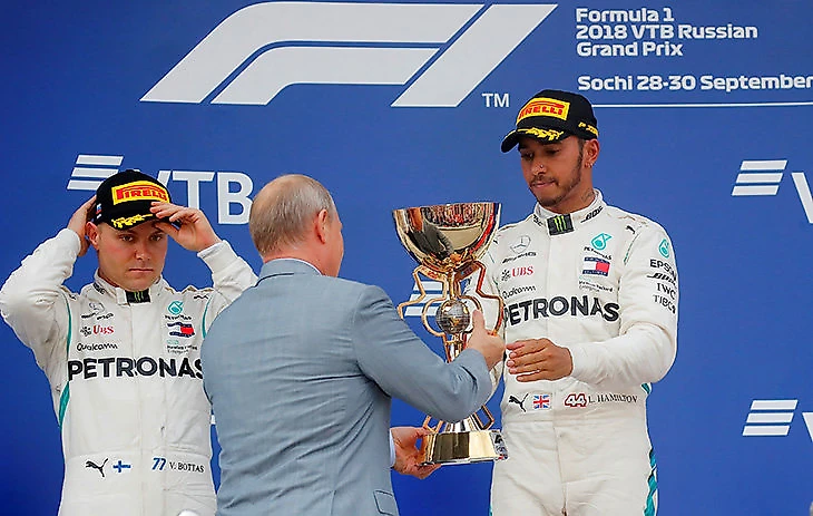 На подиуме главный приз за победу на Гран-при России стабильному «Мерседесу» стабильно вручает один и тот же человек – президент России Владимир Путин.