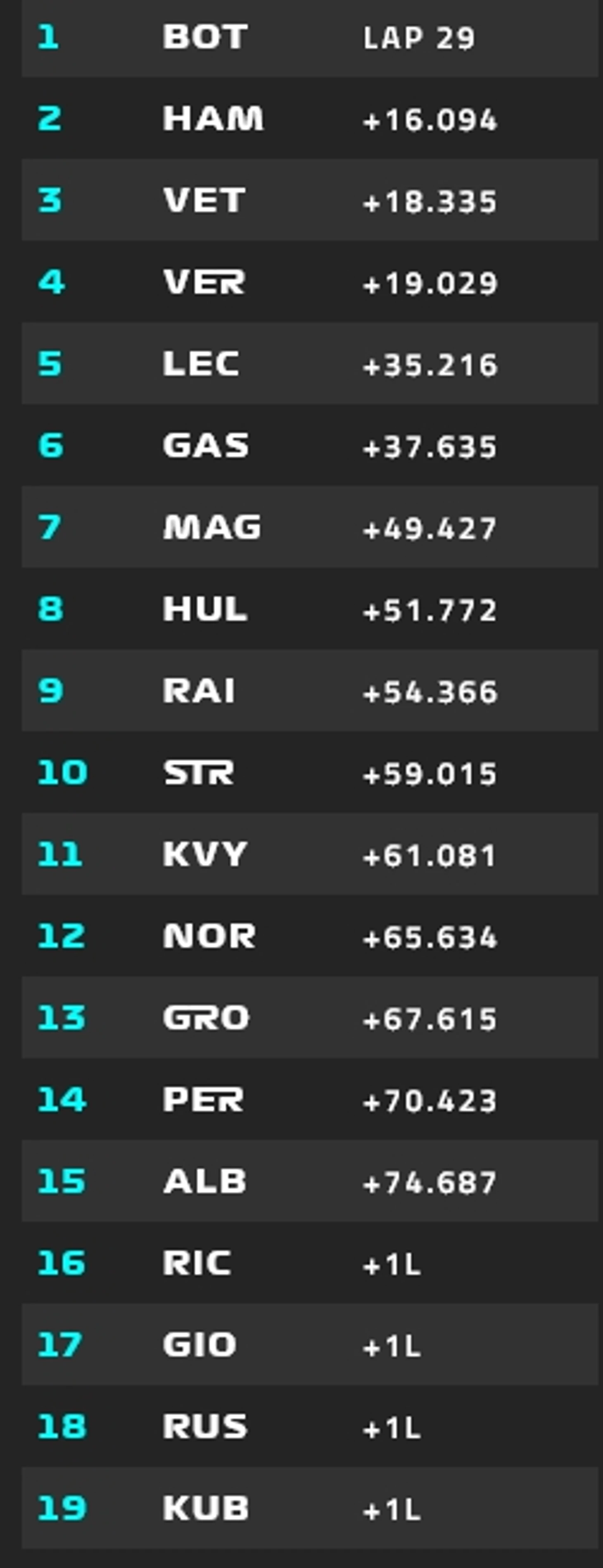 29-й круг. В топ-3 без изменений: Боттас, Хэмилтон, Феттель.