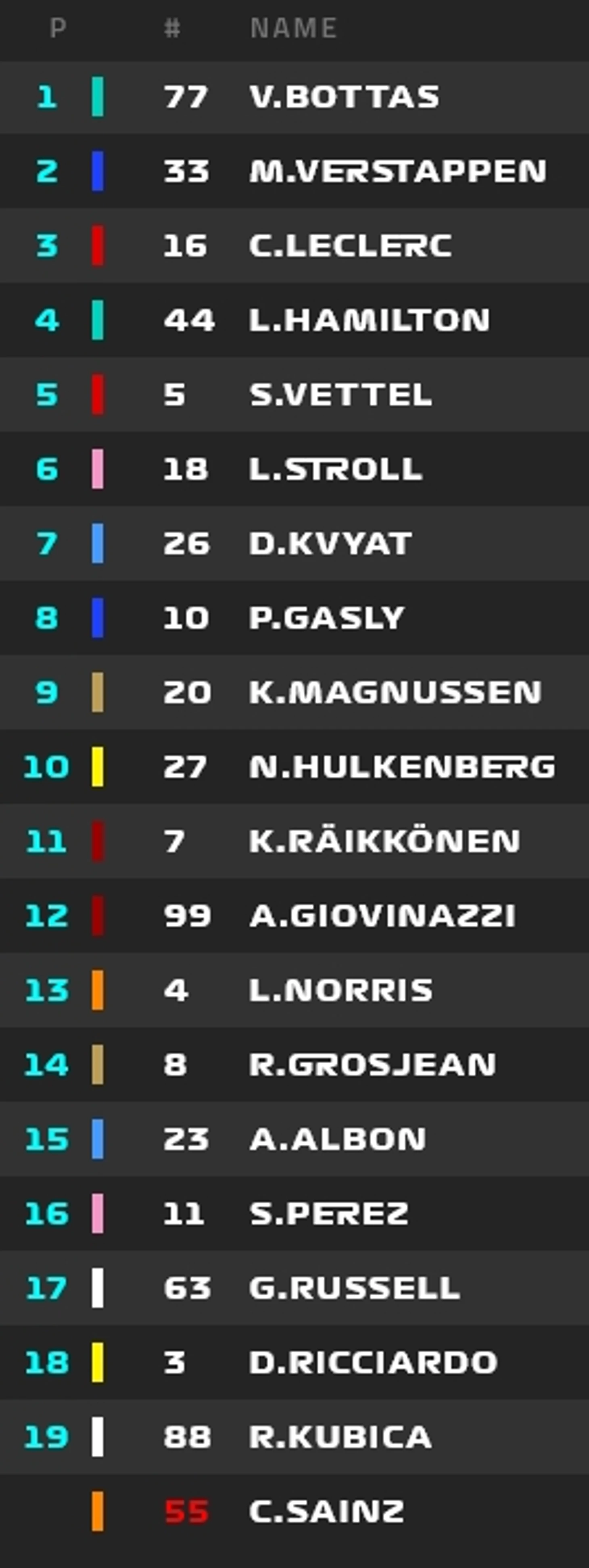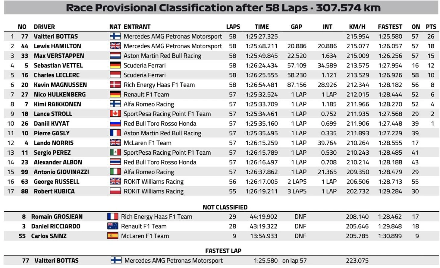 4-й круг. Первые круги гонки проходят спокойно. Боттас оторвался от Хэмилтона на 1,5 секунды, Феттель проигрывает второму «Мерседесу» 1,4 секунды, далее следуют Ферстаппен, Леклер, Магнуссен, Грожан, Хюлькенберг, Райкконен, Норрис. Квят только 15-й.