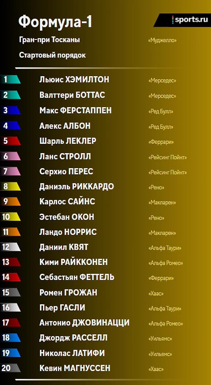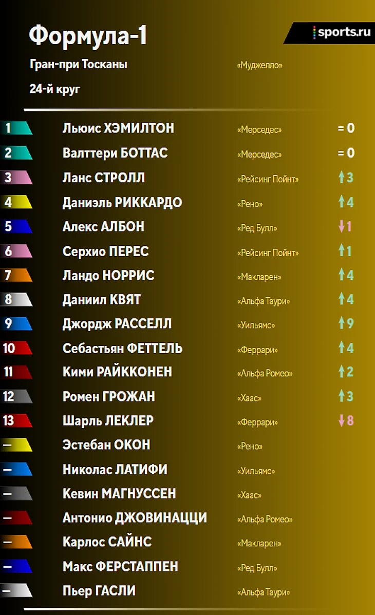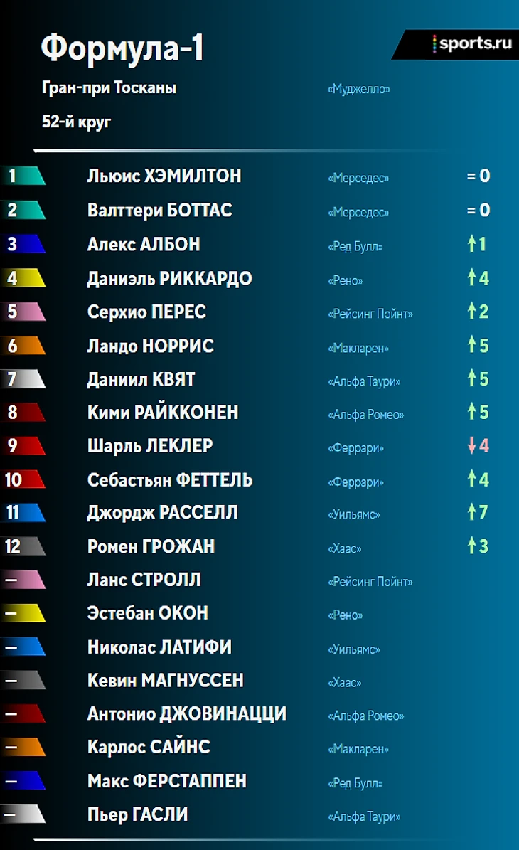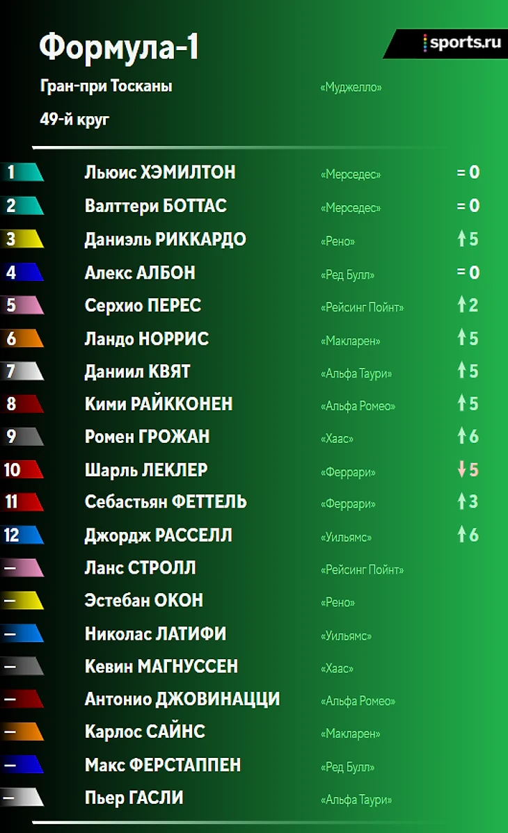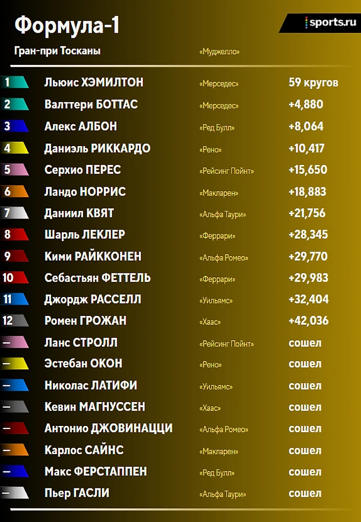 Финиш. Льюис Хэмилтон выигрывает Гран-при Тосканы! Валттери Боттас финиширует вторым, Албон – третий!