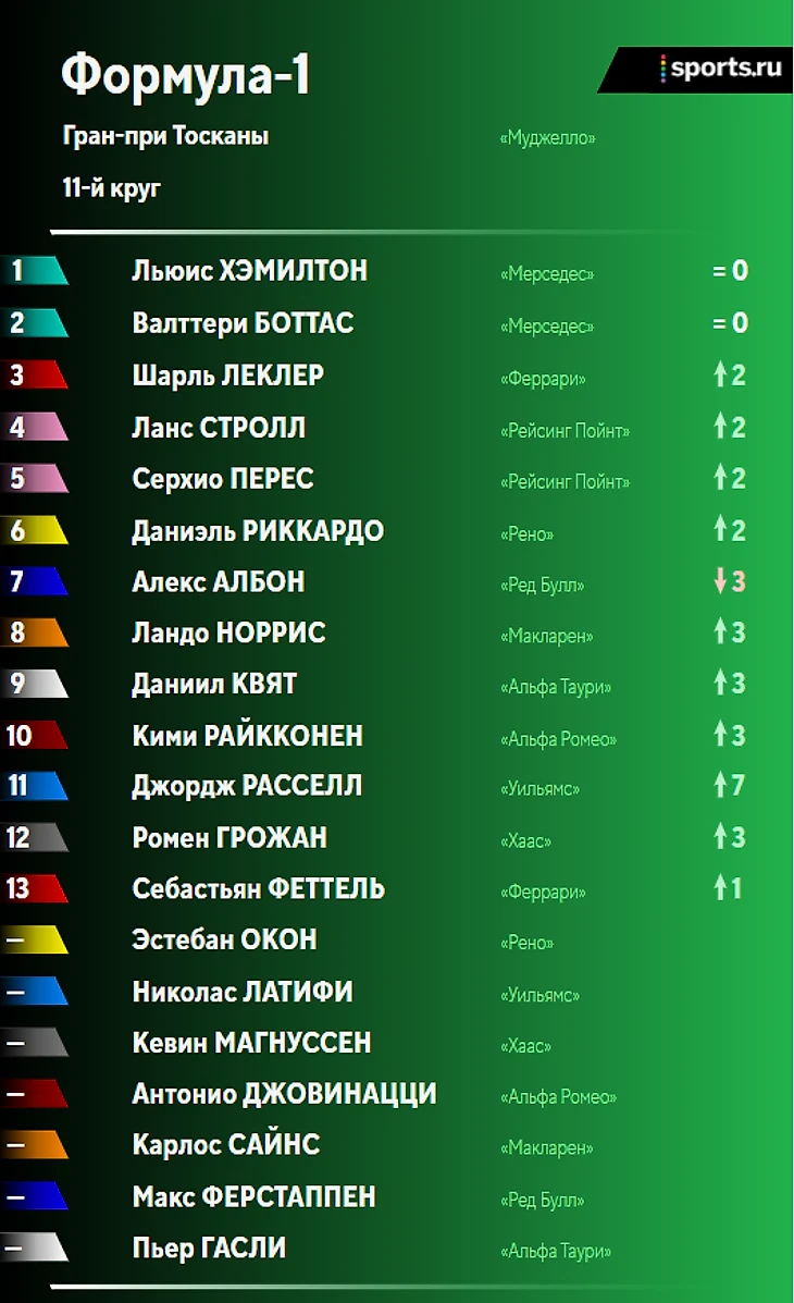 11-й круг Два «Мерседеса» просто уезжают от Леклера, отрыв уже составляет 3,5 секунды! На Шарля давят «Рейсинг Пойнт».
