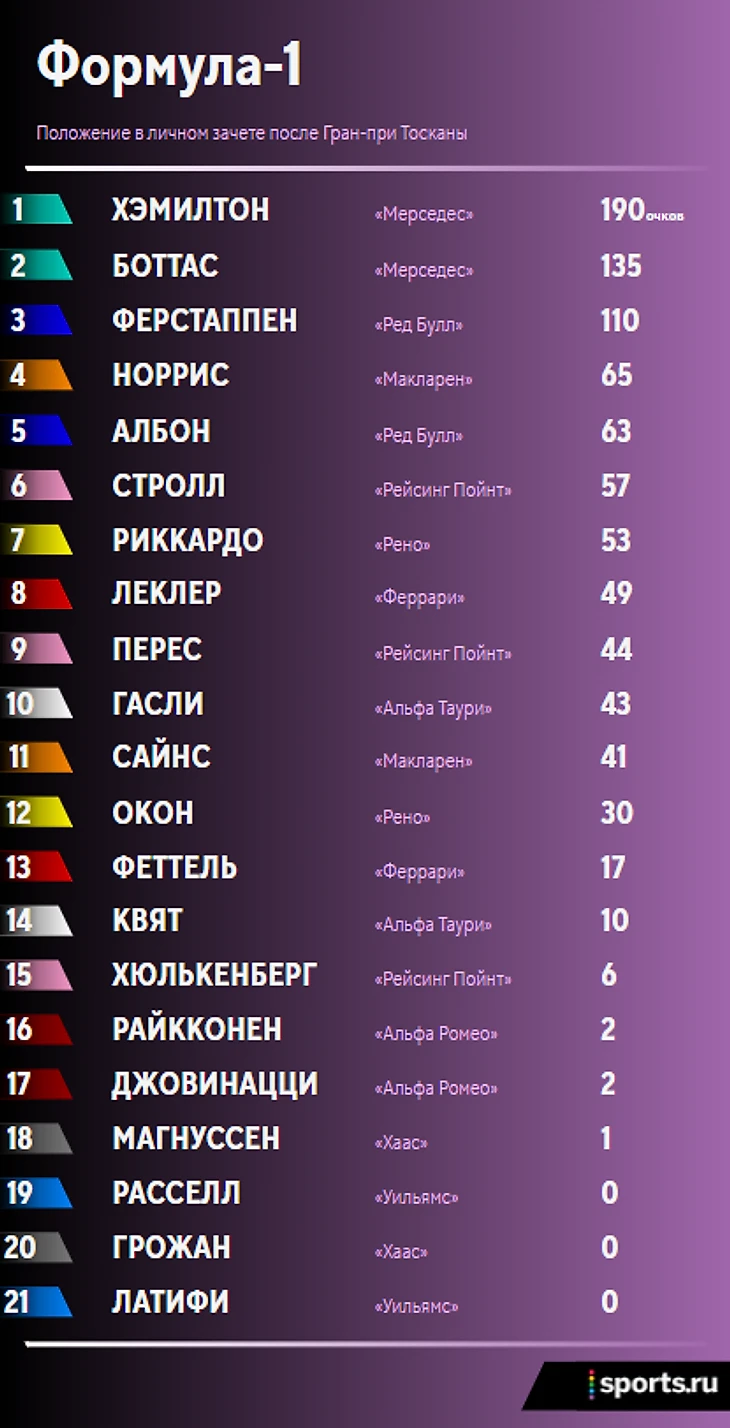 1000-й Гран-при «Феррари». Хэмилтон выиграл после рестартов, Албон наконец попал на подиум, Квят – в топ-10