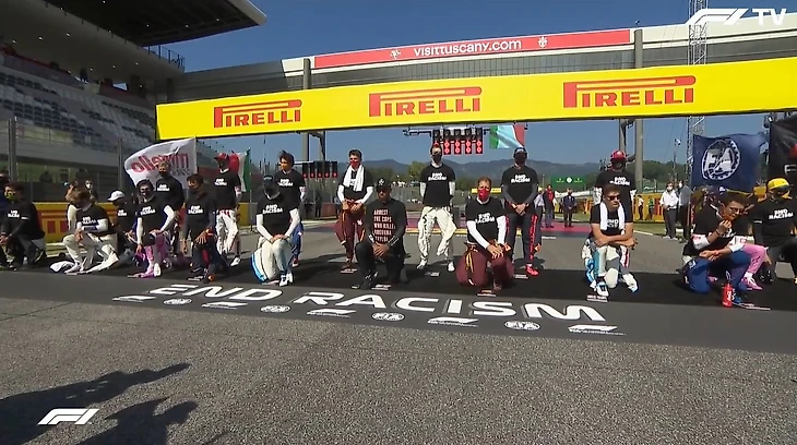 А гонщики, уже как обычно, приняли участие в акции в поддержку борьбы с расизмом.