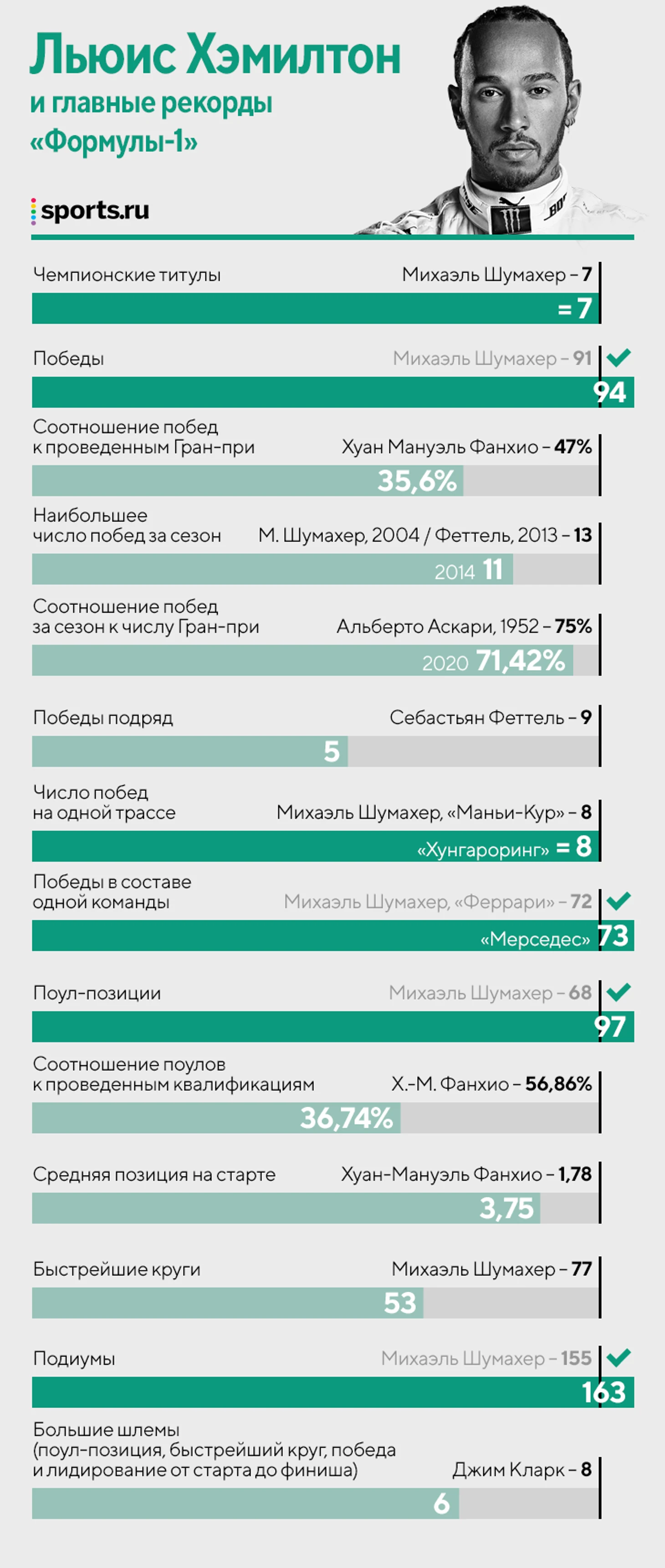 Хэмилтон – лучший в истории «Формулы-1»: сравнялся с Шумахером по титулам, выиграл больше всех гонок и поул-позиций