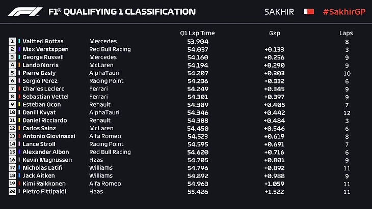 21:03 Топ-10: Боттас, Расселл, Ферстаппен, Леклер, Перес, Квят, Риккардо, Сайнс, Гасли, Стролл.