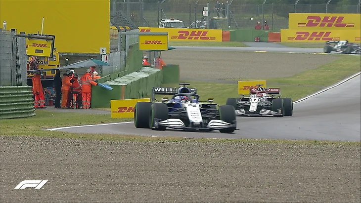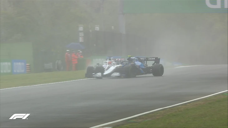 14-й круг Джордж Расселл пытается по максимуму использовать нестандартные условия – гонщик «Уильямса» только что обогнал Пьера Гасли, который теряет скорость, и вышел на 10-е место!