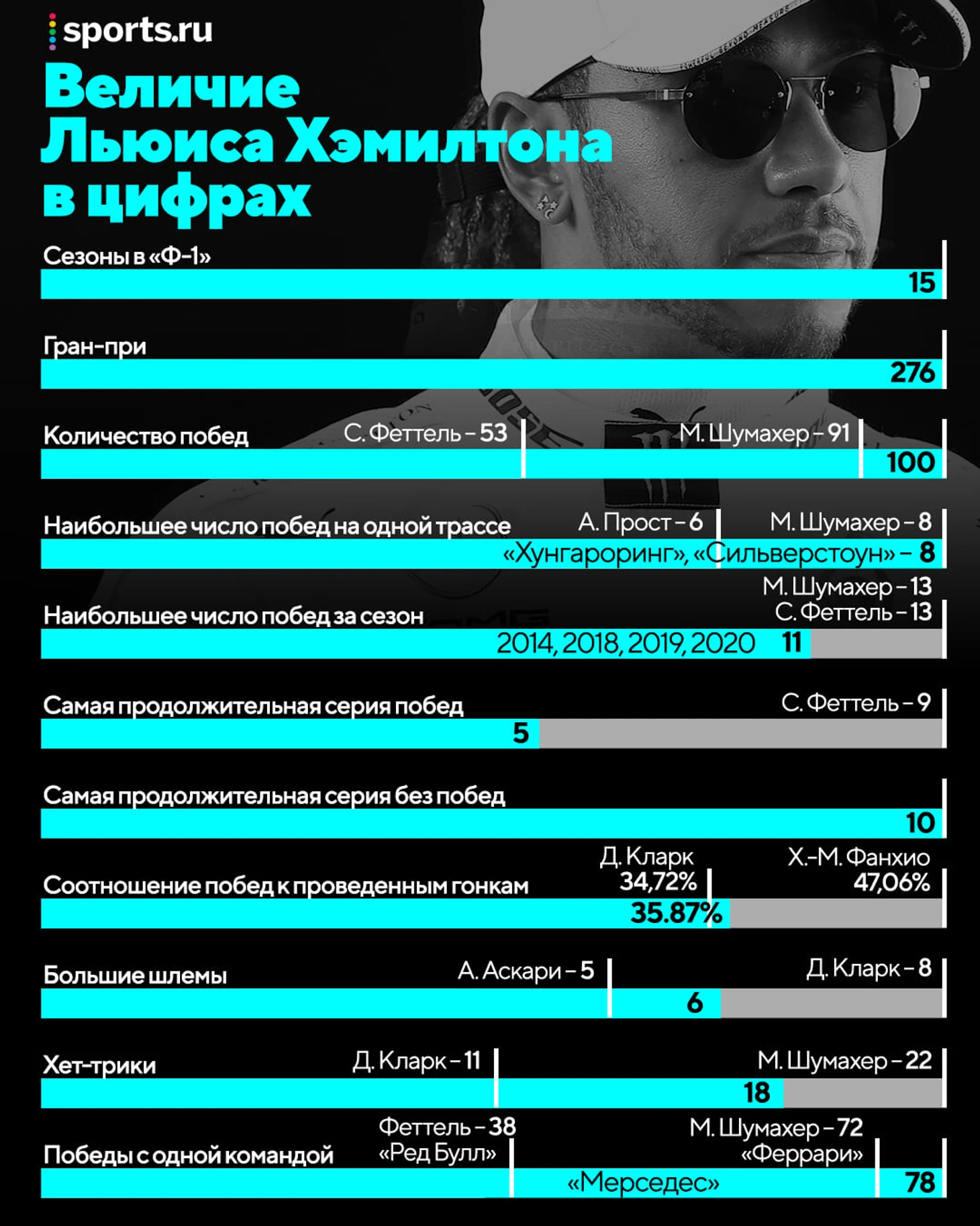 В начале карьеры Льюис выступал за «Макларен», однако вскоре после перехода в «Мерседес» начал погоню за главными рекордами и почти везде преуспел: сравнялся с Михаэлем Шумахером по количеству выигранных чемпионских титулов (7), превзошел всех конкурентов по выигранным поул-позициям (101) и подиумам (176). Наконец, у англичанина больше всего побед в истории с одной командой (79 – с «Мерседесом»).