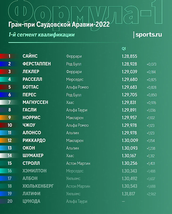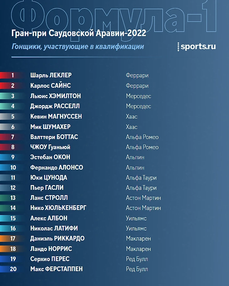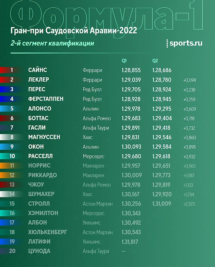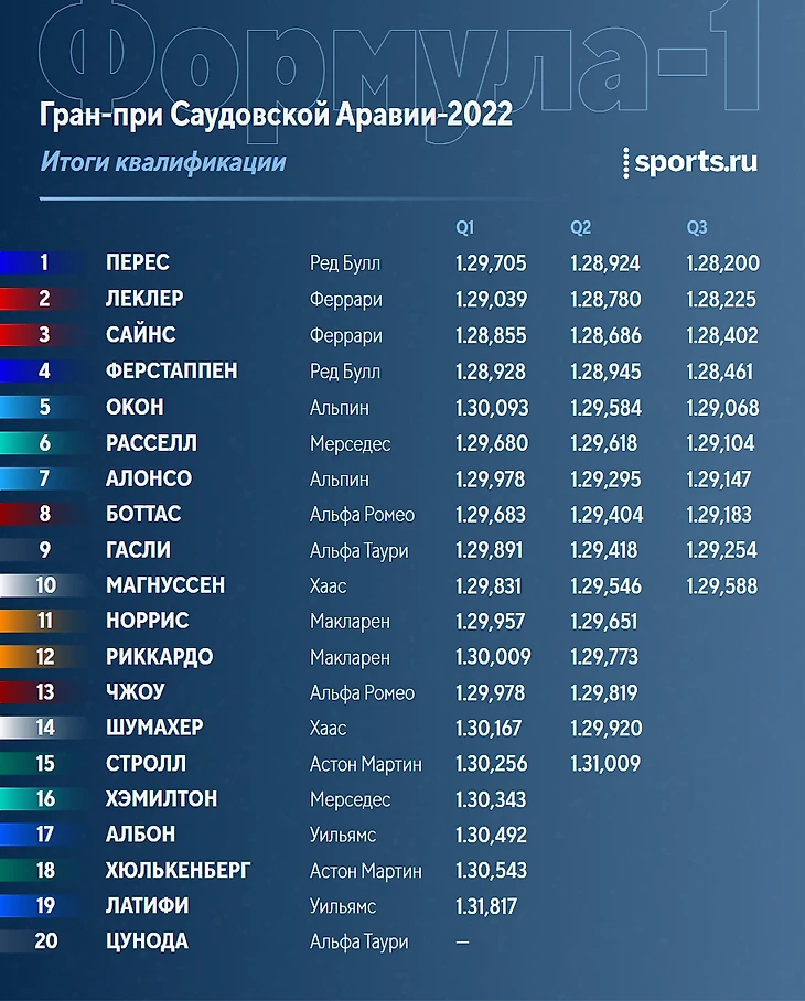 Такой вышла квалификация к Гран-при Саудовской Аравии. Спасибо, что были с нами, увидимся завтра - старт в 20:00.