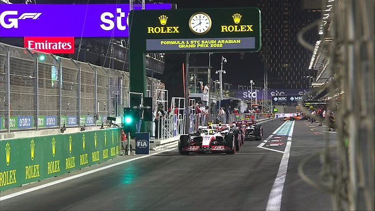 Стартовал первый сегмент - загорелись зеленые огни, машинам разрешено выезжать из боксов.