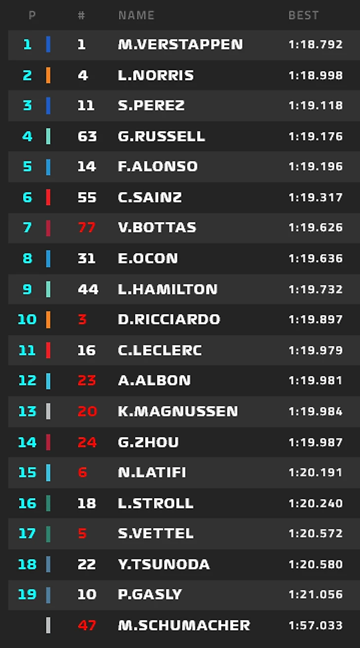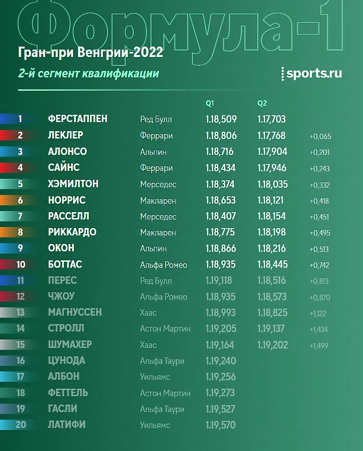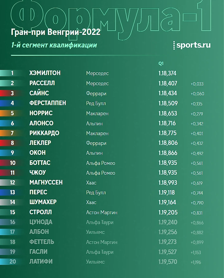 На последних секундах порядок в пелотоне резко изменился: Стролл наконец-то опередил Феттеля и пробился на 15-е место, Цуноде не хватило совсем чуть-чуть - он оказался 16-м. Кроме него выбыли Албон, Феттель, Гасли и Латифи. Что интересно - Гасли показал хорошее время, но нарушил границы трассы - его время удалили. А Латифи остался последним даже несмотря на лучший первый сектор круга!