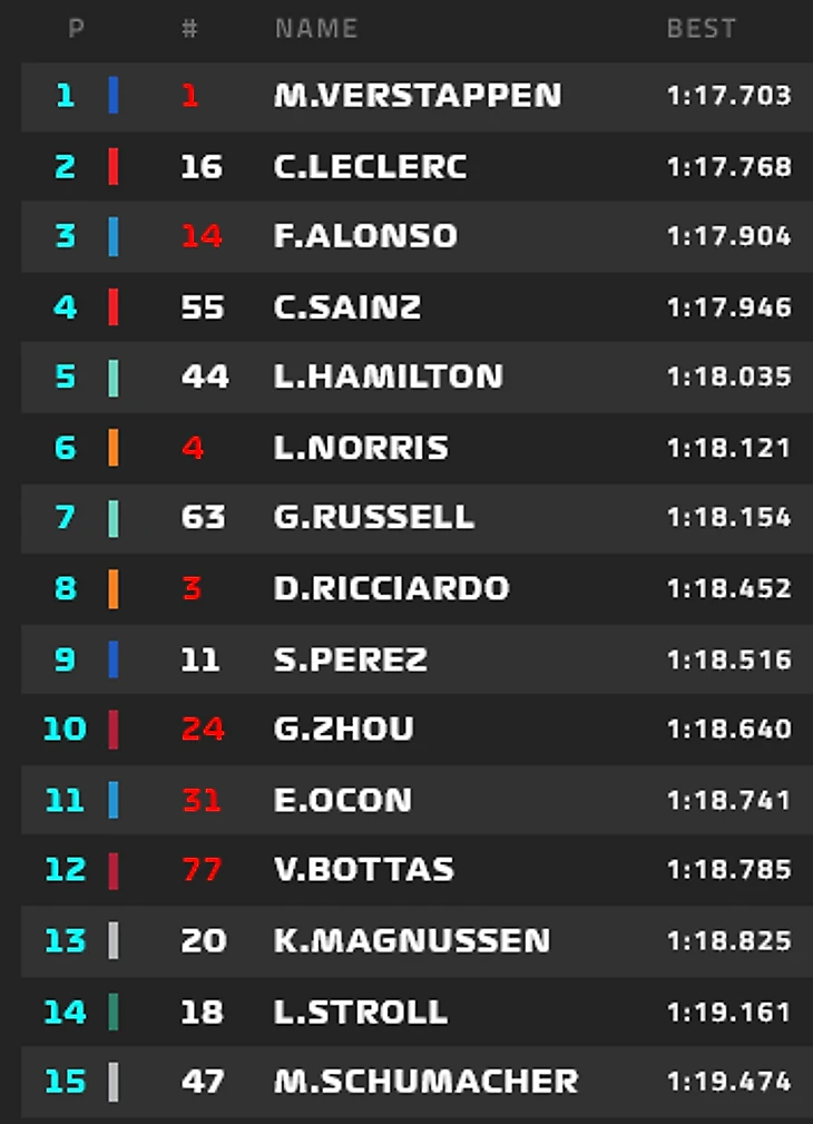 Почти все пилоты проехали по одному быстрому кругу. Мы ждем парней из "Феррари" - они скорее всего займут первое и второе места в протоколе, а без них пока группа лидеров выглядит следующим образом: Ферстаппен, Перес, Расселл, Норрис, Боттас, Хэмилтон, Алонсо.