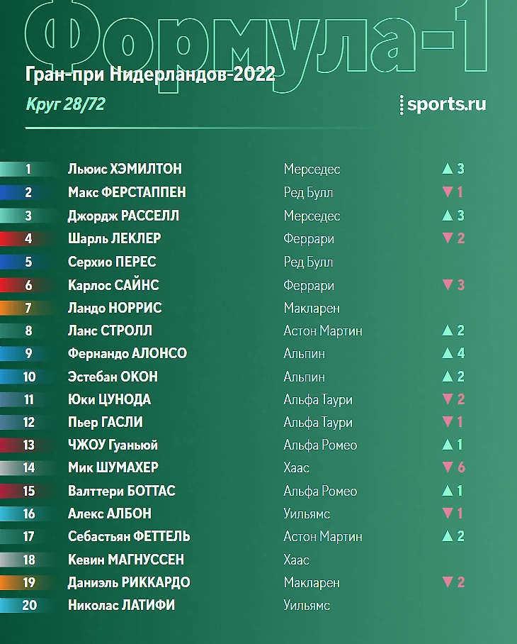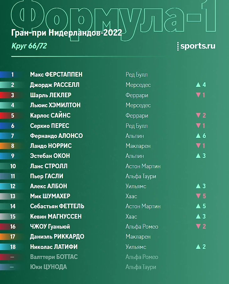 Впереди ситуация стабилизировалась. Ферстаппен уверенно уехал от Расселла, а сам Джордж удерживает преимущество над Леклером. А вот Сайнс Хэмилтона догнать не может.