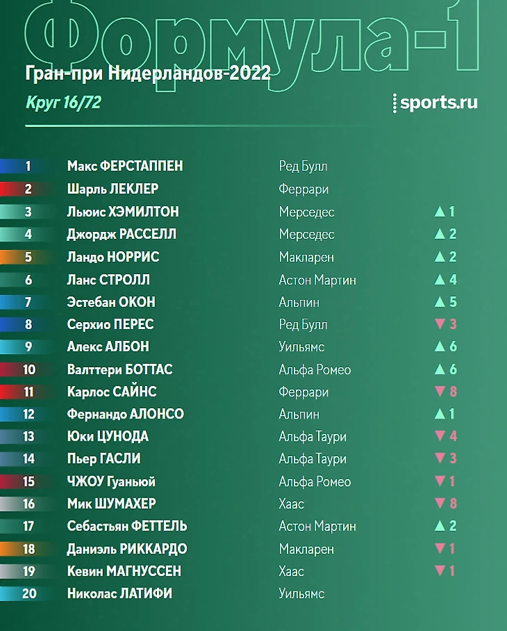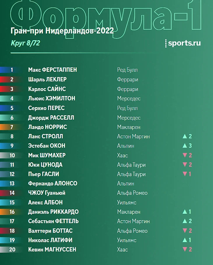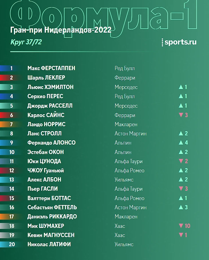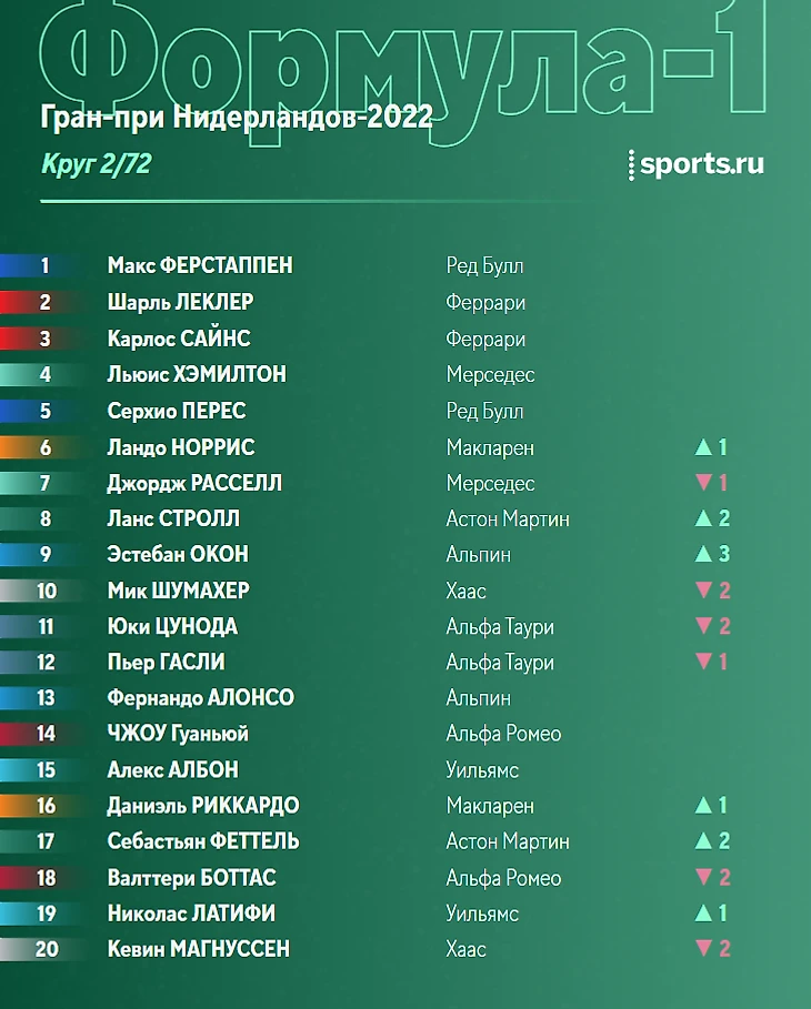 Началось! Ферстаппен удержал лидерство, Хэмилтон и Сайнс сцепились в первом повороте, но "Феррари" осталась впереди. А вот Расселл откатился на 7-е место.